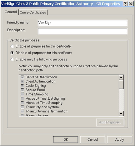 Ubique y deshabilite VeriSign Class 3 Public Primary Certification Authority - G5 Root CA certificate