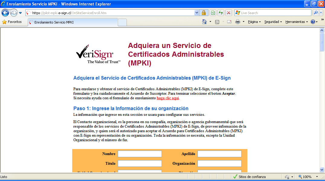 Paso 1: Ingrese los datos de la organización para la cuenta MPKI y los datos del contacto Organizacional para la cuenta. El contacto Organizacional es quien aceptará en nombre de la organización el Acuerdo de Certificados Administrables, y también es quien autorizará la solicitud de la cuenta y a la persona registrada como contacto técnico que administrará la cuenta MPKI, lo que implica la emisión, revocación, suspensión de los certificados, así como también el rechazo de solicitudes de certificado.