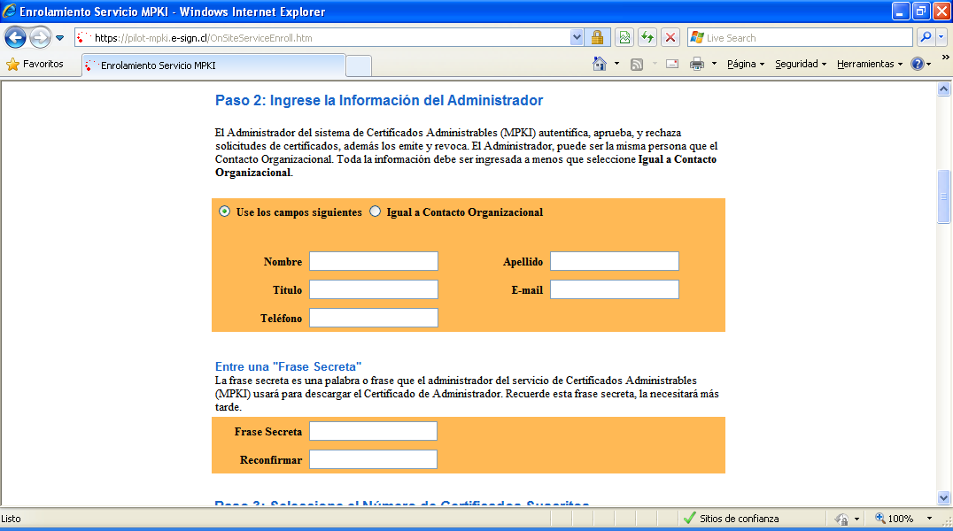 Paso 2: Aquí debe ingresar la información del Administrador de la cuenta, o Contacto Técnico. El Contacto Técnico es el encargado de administrar la plataforma de Certificados Administrables (MPKI) y además es el encargado de mantener las comunicaciones de soporte con e-Sign.
