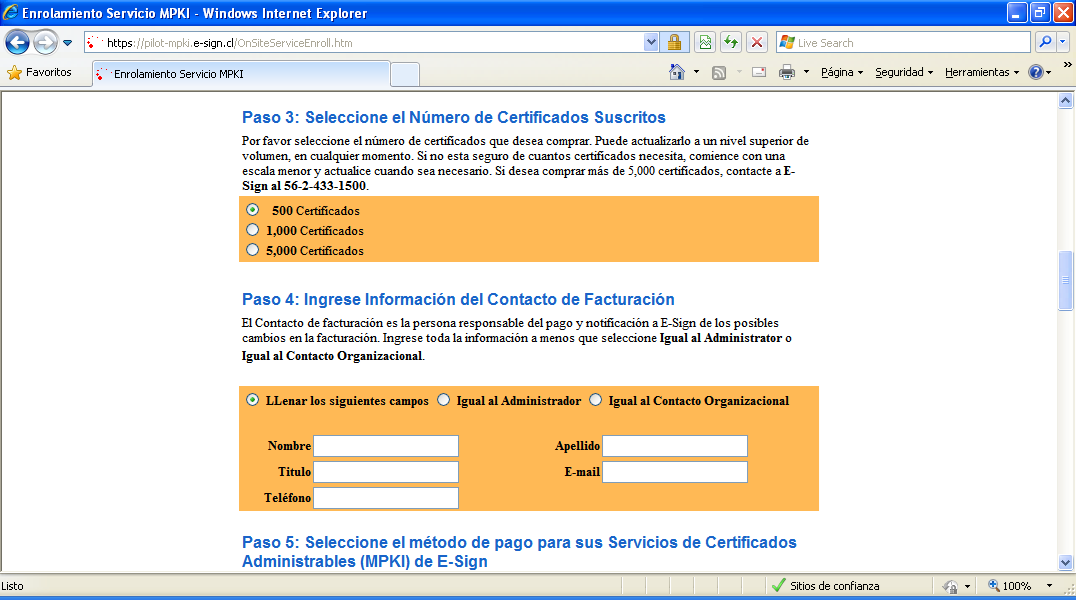 Paso 3: En este paso debe ingresar el número de unidades de certificados que requiere para la cuenta MPKI. Recuerde que en el futuro usted podrá comprar más unidades de certificados desde la opción Support and Services del centro de control de su cuenta MPKI. Si tiene dudas respecto a la cantidad de certificados que necesita, comuníquese con un agente del Departamento de Ventas de e-Sign llamando al 02-4331500 opción 1.