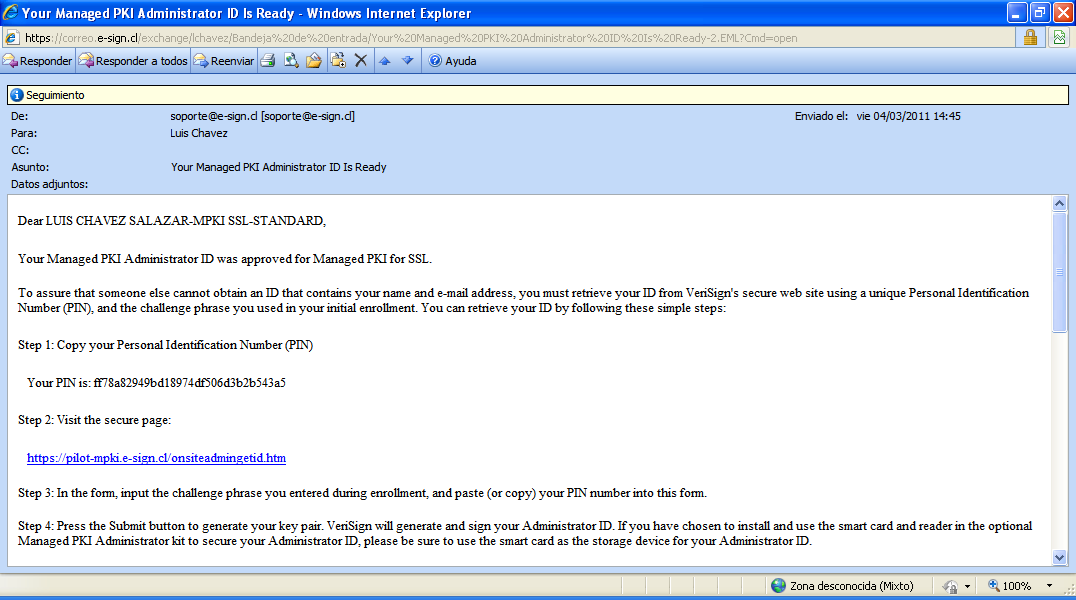 Abra el correo electrónico recibido de soporte@e-sign.cl, con el asunto Your Managed PKI Administrator ID Is Ready.