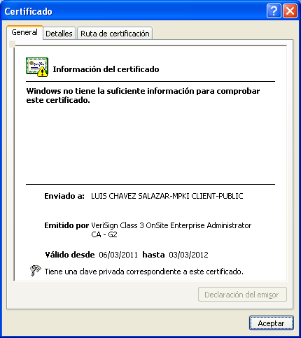 Para revisar que el certificado esté bien instalado en el navegador, por favor haga clic en Herramientas > Opciones de Internet > Contenido > Certificados > Personal, usted verá aparecer su nombre. Haga doble clic sobre su nombre y verá los detalles y la validez del certificado.