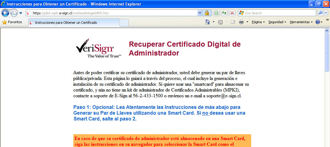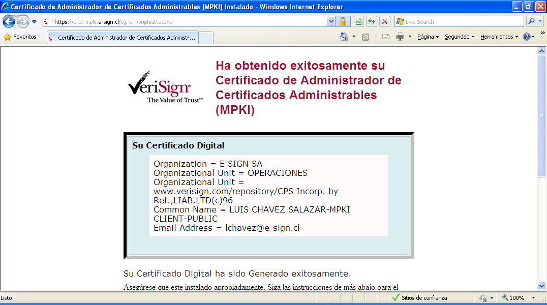 Usted recibirá un mensaje de correo de la casilla soporte@e-sign.cl, con el asunto Your Managed PKI Administrator ID Is Ready.