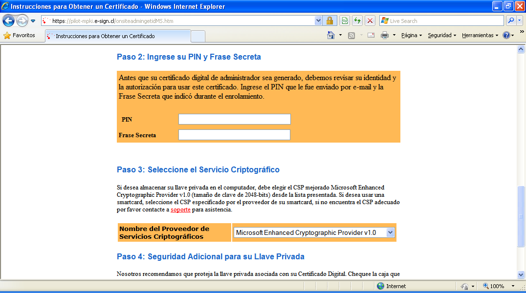 Pegue el número PIN que copió desde el paso 1 del correo de aprobación e ingrese la Frase Secreta que definió cuando realizó el enrolamiento para obtener la cuenta MPKI Lite.