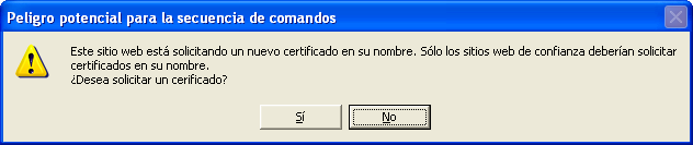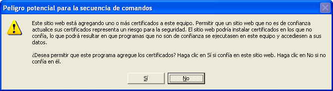 Windows muestra una advertencia que indica que se están realizando operaciones de certificados digitales en su nombre, solamente los sitios de confianza deberían solicitar certificados en su nombre. Confirme la operación haciendo clic en el botón Sí.