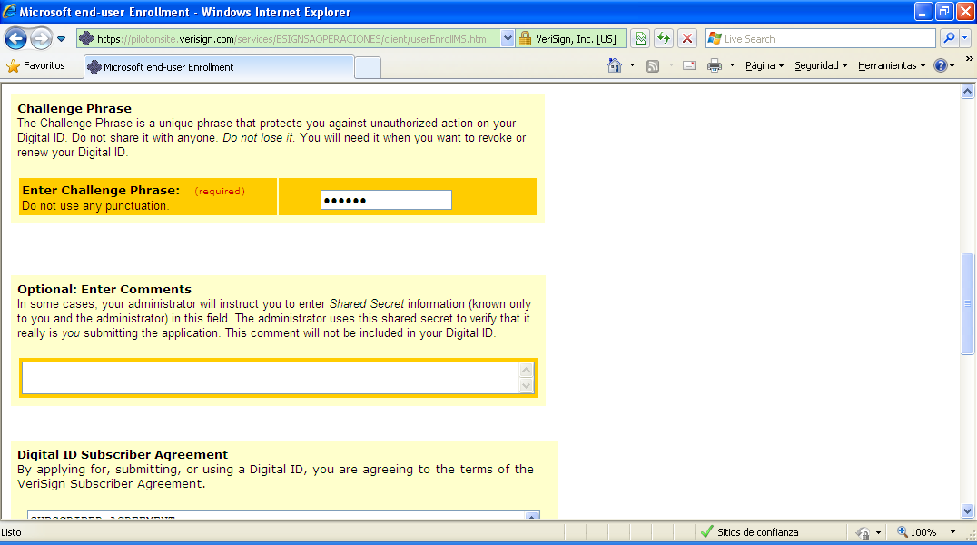 Paso 3: Ingrese una frase secreta en el campo Challenge Phrase. Esta frase secreta será requerida en caso de que necesite revocar su certificado online. También tiene la opción de ingresar un comentario para el administrador en el campo Enter Comments.