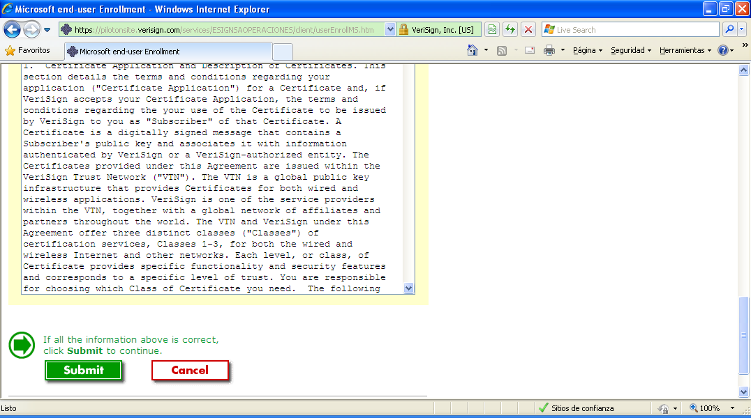 Paso 4: Lea cuidadosamente el acuerdo del suscriptor. Si está de acuerdo con él haga clic en Submit para generar su solicitud de certificado digital. Si no está de acuerdo haga clic en Cancel para anular la petición de certificado.