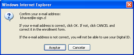 Si usted presiono la opción Submit, Windows muestra un cuadro que le pide que verifique que la dirección de correo ingresada está correcta. Si la dirección está correcta haga clic en Aceptar, en caso contrario, haga clic en Cancelar para corregir los posibles errores en el ingreso de la dirección de correo electrónico.