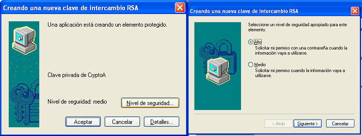 Un mensaje que indica que se está creando una nueva clave de intercambio RSA aparece. Haga clic en el botón Nivel de Seguridad y póngalo en Alto.