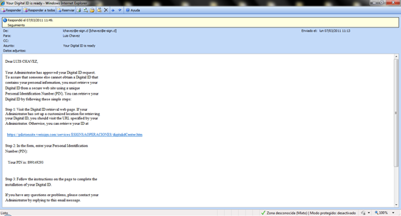 Una vez que el administrador haya aprobado la solicitud de certificado digital, usted recibirá un correo electrónico con los datos para que descargue su certificado digital. Recuerde que antes de descargar su certificado digital, debe tener la precaución de haber aplicado la configuración de seguridad que permite agregar certificados digitales. Haga clic aquí para ver la configuración.