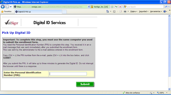 Copie el numero PIN (Personal Identification Number) que aparece en el paso 2 del correo de aprobación y péguelo en el apartado Enter the Personal Identification Number (PIN), posteriormente haga clic en Submit.