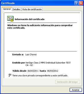 Para revisar que el certificado esté instalado en el navegador, por favor haga clic en Herramientas > Opciones de Internet > Contenido > Certificados > Personal, usted verá que aparece su nombre. Haga doble clic sobre su nombre y verá los detalles y la validez del certificado.