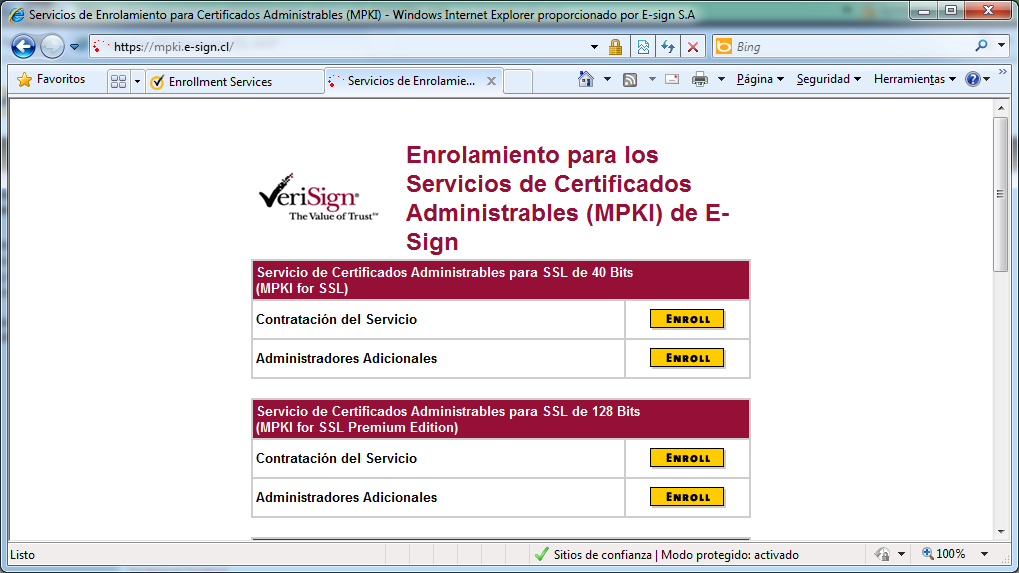 Seleccione si su cuenta es para certificados de 40 o 128 bits y seleccione la opción Contratación del Servicio.