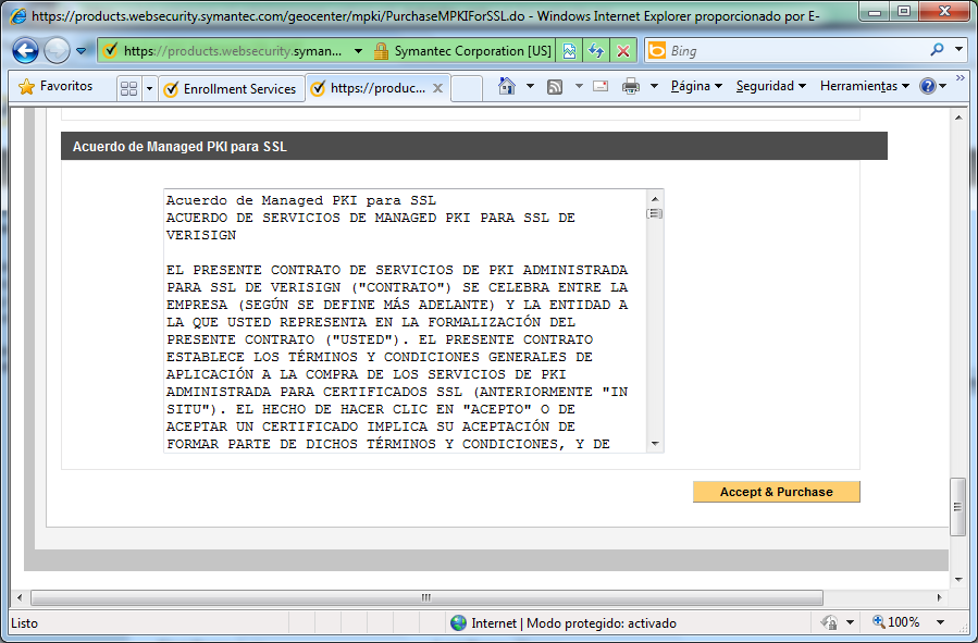 Lea cuidadosamente el acuerdo del suscriptor, y si está de acuerdo, acepte y termine el enrolamiento. En caso de no estar de acuerdo con el Acuerdo de Managed PKI para SSL, cierre su navegador para cancelar el enrolamiento.