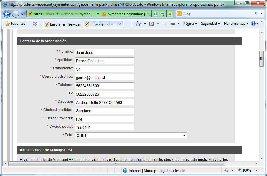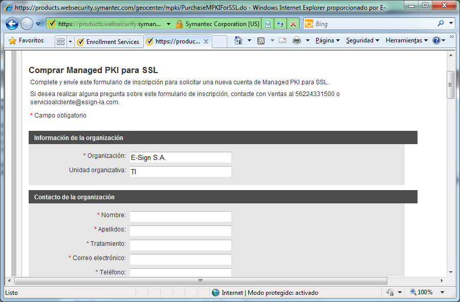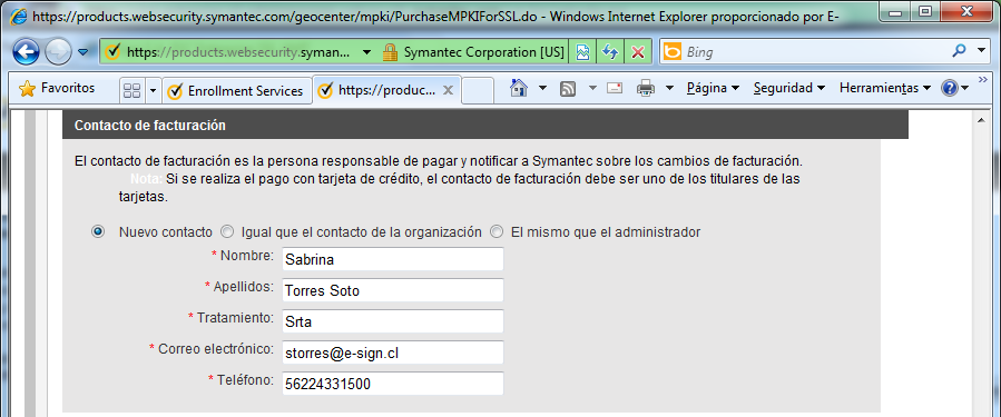 Ingrese la información del contacto de facturación de la cuenta MPKI for SSL. Por favor note que: