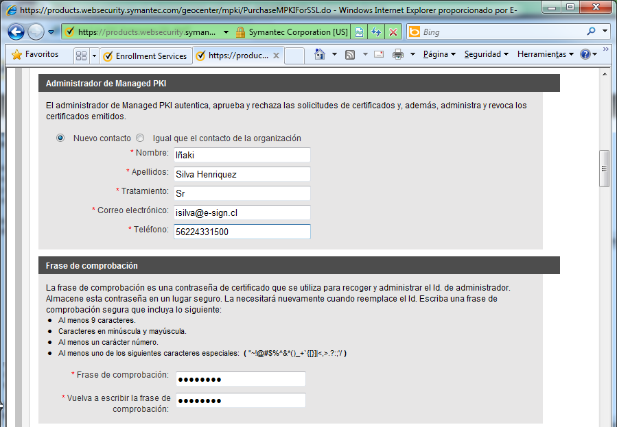 - Guarde la frase de comprobación en un lugar seguro, ya que será solicitada al momento de descargar el certificado de administrador. Verisign y E-Sign no guardan respaldo de las frases de comprobación de los usuarios.
