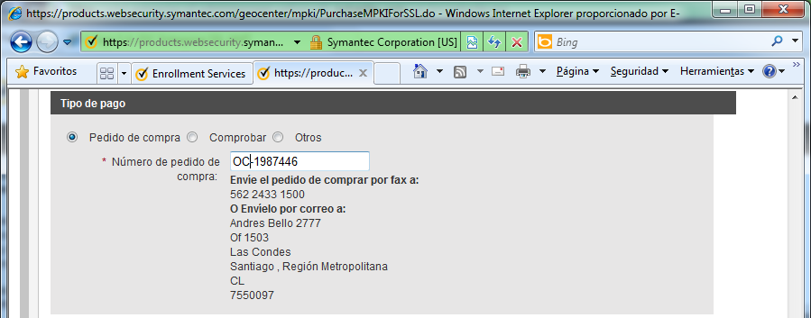 A continuación ingrese la información de pago para la cuenta MPKI for SSL.