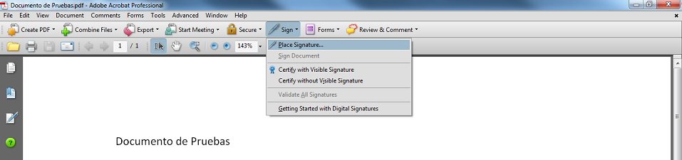 Para firmar digitalmente un documento Acrobat, debe abrir el documento PDF y haga clic en el botón Firmar del menú y luego haga clic en la opción Firmar este documento…