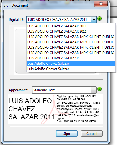 Después de seleccionar el área donde aplicará la firma, se muestra una ventana que solicita que seleccione un certificado digital: