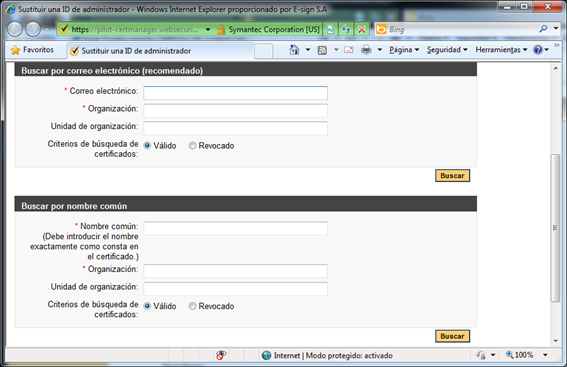 Para remplazar un certificado de administrador, debe ingresar en el centro de control de la cuenta y hacer clic en Support and Services y luego en Replace Administrator ID, donde se mostrará una ventana, donde usted debe realizar la búsqueda de su certificado de administrador. Existen 2 formas de buscar el certificado de administrador, buscar por correo electrónico (recomendado) y buscar por Common Name. Por favor note que al realizar una búsqueda, todos los campos marcados con (*) son obligatorios.