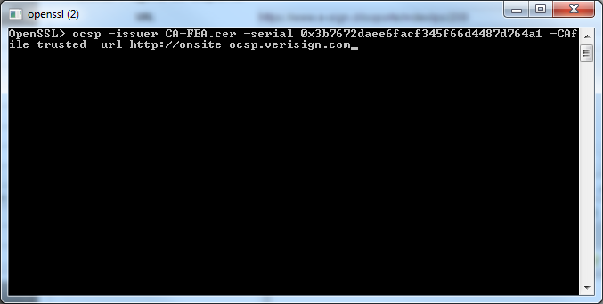 OpenSSL> ocsp -issuer CA-FEA.cer -serial 0x3b7672daee6facf345f66d4487d764a1 –CAfile trusted -url http://onsite-ocsp.verisign.com