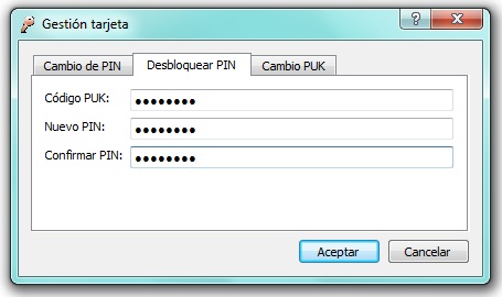Paso 3 Desbloqueo PIN: Se desplegará la ventana Gestión Tarjeta, donde debe hacer clic sobre la pestaña Desbloquear PIN e ingrese el PUK actual (*) y el nuevo PIN.