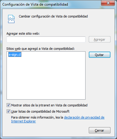 Para agregar el sitio de E-Sign a la lista de vista de compatibilidad:
