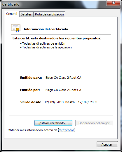 Para instalar el certificado de raíz debe darle doble clic al archivo y podrá ver la información del certificado, donde debe hacer clic en Instalar certificado…