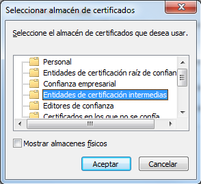 Seleccione la opción Entidades de certificación intermedias y haga clic en Aceptar