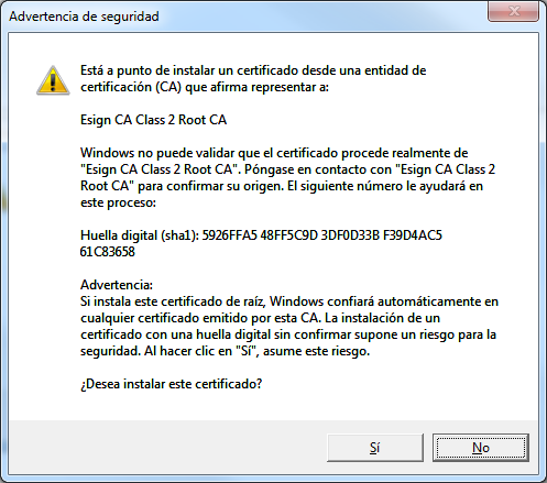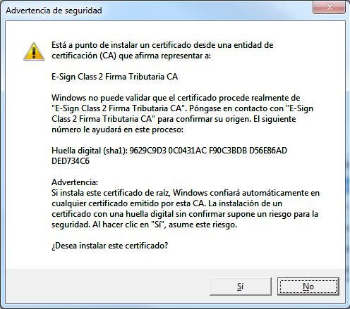 Haga clic en Sí para finalizar la instalación. Una vez finalizada la instalación el sistema le mostrará una confirmación de instalación del certificado: