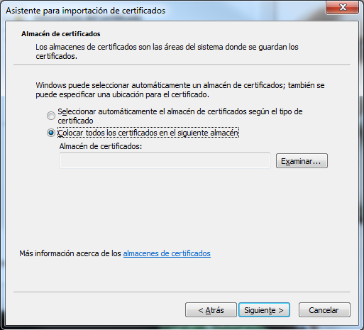 Seleccione la opción Colocar todos los certificados en el siguiente almacén de certificados y haga clic en Examinar: