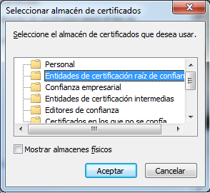 Seleccione la opción Entidades de certificación raíz de confianza y haga clic en Aceptar