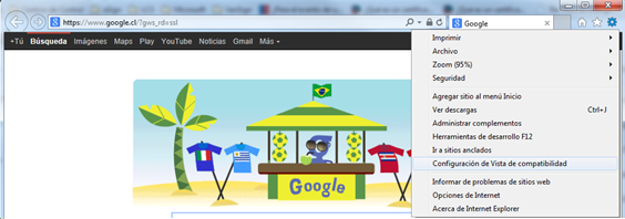 Abra Internet Explorer y haga clic en el botón Herramientas y luego en Configuración de Vista de Compatibilidad.
