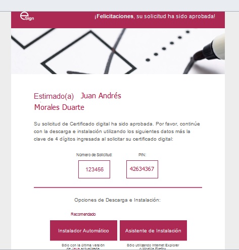 Una vez que su certificado digital sea aprobado, el usuario recibirá un correo similar al siguiente: