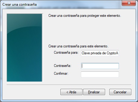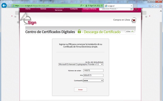 El usuario debe ingresar una contraseña para su certificado digital. Por favor note que no necesariamente debe ser la misma que uso durante la solicitud de certificado digital. ESign recomienda que las contraseñas sean almacenadas en un lugar seguro, ya que ESign no tiene respaldo de las contraseñas ingresadas por el usuario.