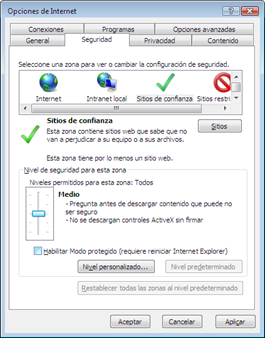 Abra Internet Explorer. En el menú Herramientas, seleccione Opciones de Internet y luego haga clic en la pestaña de Seguridad.