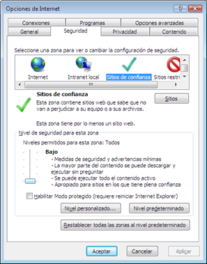 Para guardar los cambios haga clic en Aceptar. El sistema le preguntará si confirma que desea cambiar la configuración de seguridad, usted debe confirmar. Haga clic en el botón Aplicar y después en el botón Aceptar para cerrar la ventana Opciones de Internet.