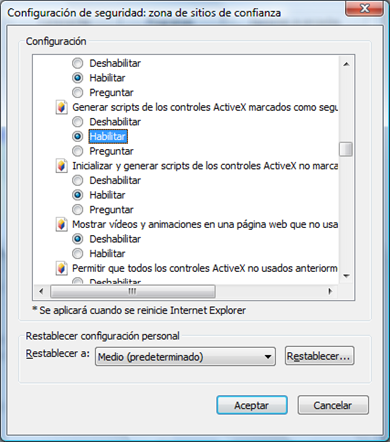 Seleccione Nivel personalizado. En la sección “Controles y Complementos de ActiveX”, seleccione en ellos la opción Habilitar. Por favor note que son mas de uno.